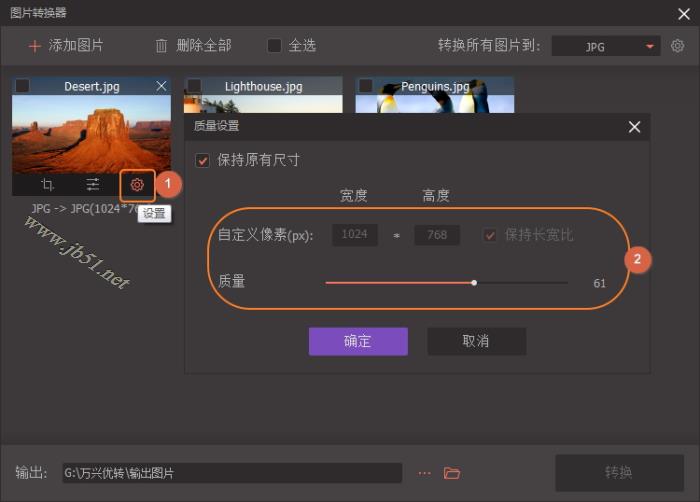 調整圖片大小:單擊圖片上的設置按鈕,質量設置窗口將會彈出。您可以選擇保留原有尺寸, 或對圖片寬度或高度進行自定義改動。移動質量條以更改圖片質量。然后單擊確定按鈕以保存更改。