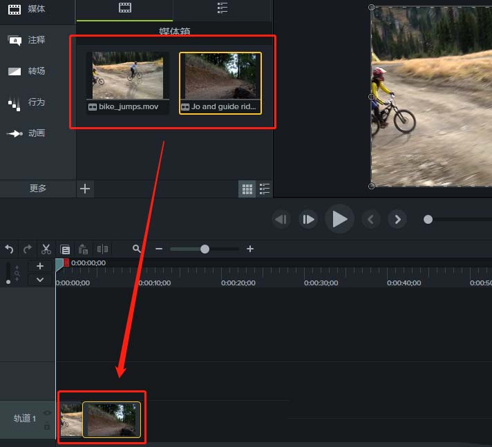 3、先選中一個媒體素材拖到時間軸軌道1,在選中另一個媒體素材拖到同一時間軸軌道前一媒體素材的后面。