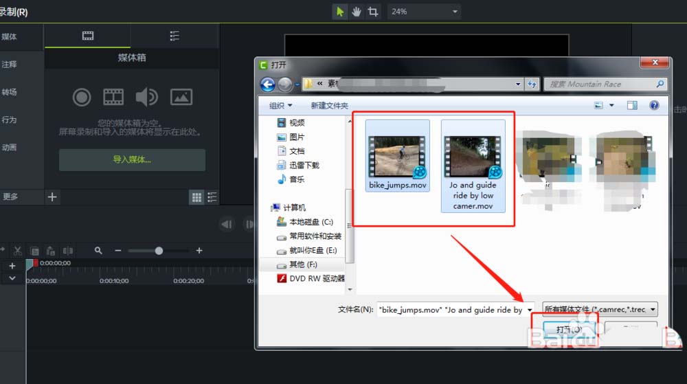 2、彈出“打開”窗口,在打開窗口中找到媒體素材存放的電腦路徑位置,然后選擇兩個媒體素材導入到Camtasia 9項目中。