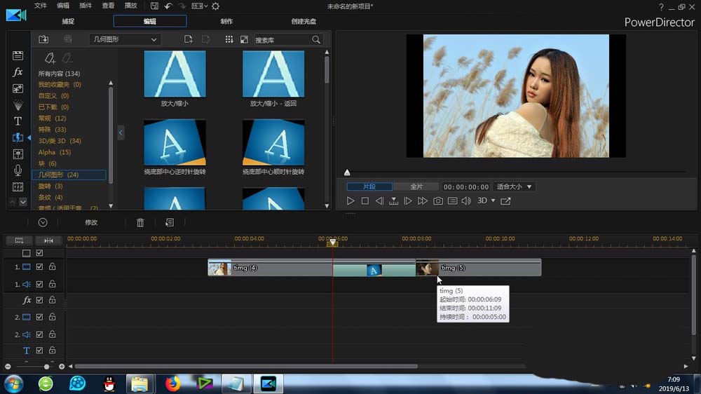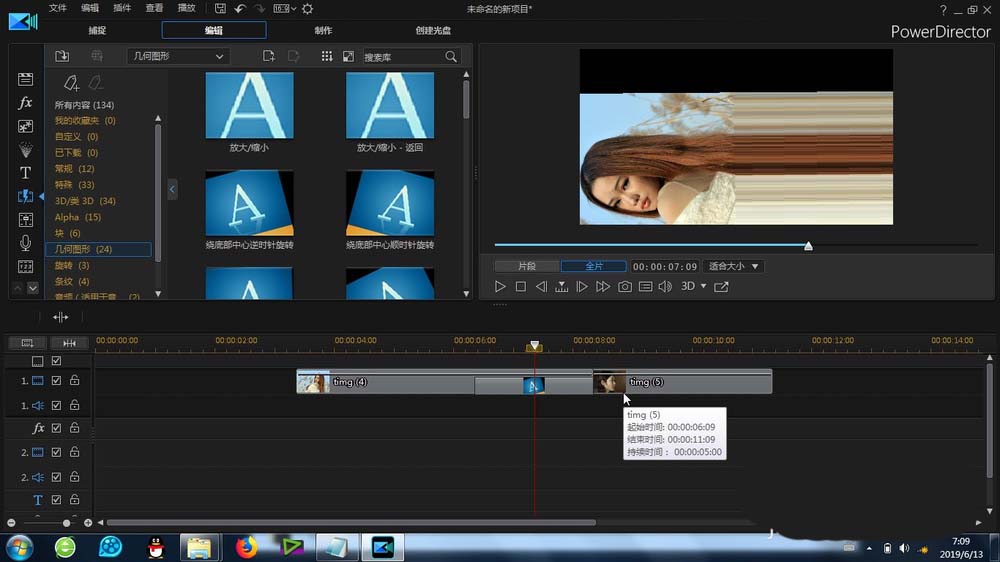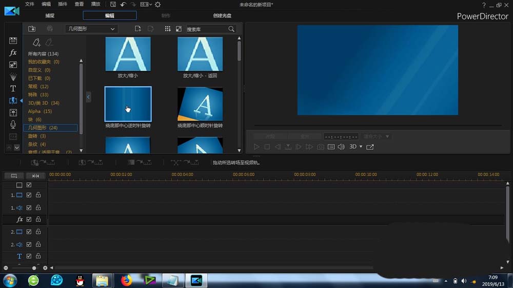 1、這里的“繞底部中心逆時針旋轉”轉場是在威力導演里面的-轉場-幾何圖形-里面可以找到