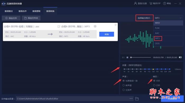 3、音頻文件添加完成之后,我們在界面中找到選擇輸出目錄,在下拉框中點擊MP3格式,然后再對它的質量、聲道、以及編碼進行設置即可。