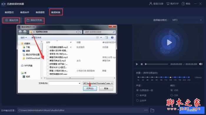 2、打開之后我們看到界面會有幾個選項這個時候點擊“音頻轉換”按鈕,接著點擊“添加文件”或者“添加文件夾”這時候會彈出一個窗口,然后我們將需要轉換的音頻文件添加到其中哦!