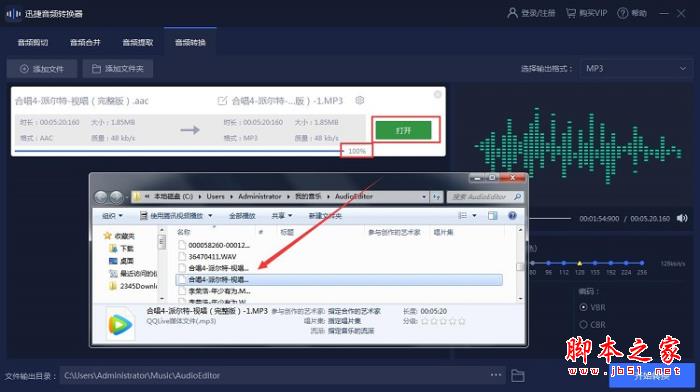 5、看是轉換完成之后,耐心等待幾秒鐘,如果界面出現進度條為100%的時候說明已經轉換成功了,點擊打開既可以查看轉換的音頻啦!