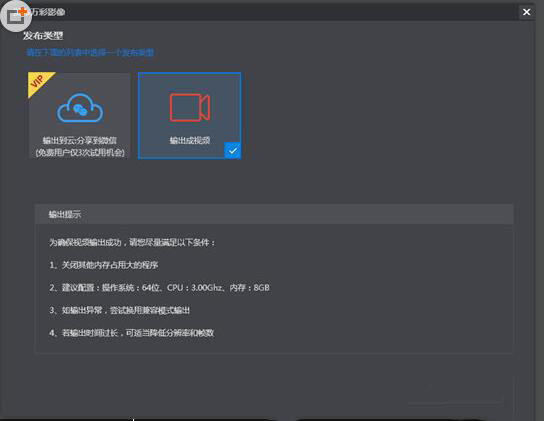 3、彈出發布萬彩影像的界面之后,一共有兩種發布類型供大家選擇,這里默認選擇“輸出成視頻”選項進行文件的輸出,之后點擊下一步,如下圖所示: