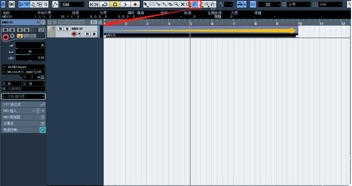 點擊上方菜單欄中的畫筆工具,在MIDI軌后面的空白處按住鼠標不放、往右拖動直至出現一片MIDI塊,如圖,