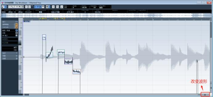 選擇“高音/彎曲”按鈕,采樣編輯器的主窗口中就會顯示音頻波形,如圖,