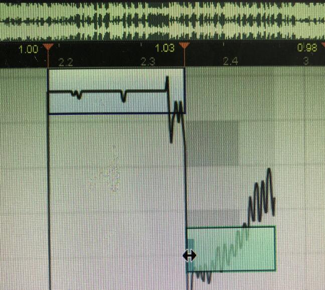 要修正節奏,對照采樣編輯器主窗口上方的節拍標尺,點按需要進行高音變化的方塊中間(鼠標呈雙箭頭),進行左右拖拽,將其拉伸到需要的位置上,