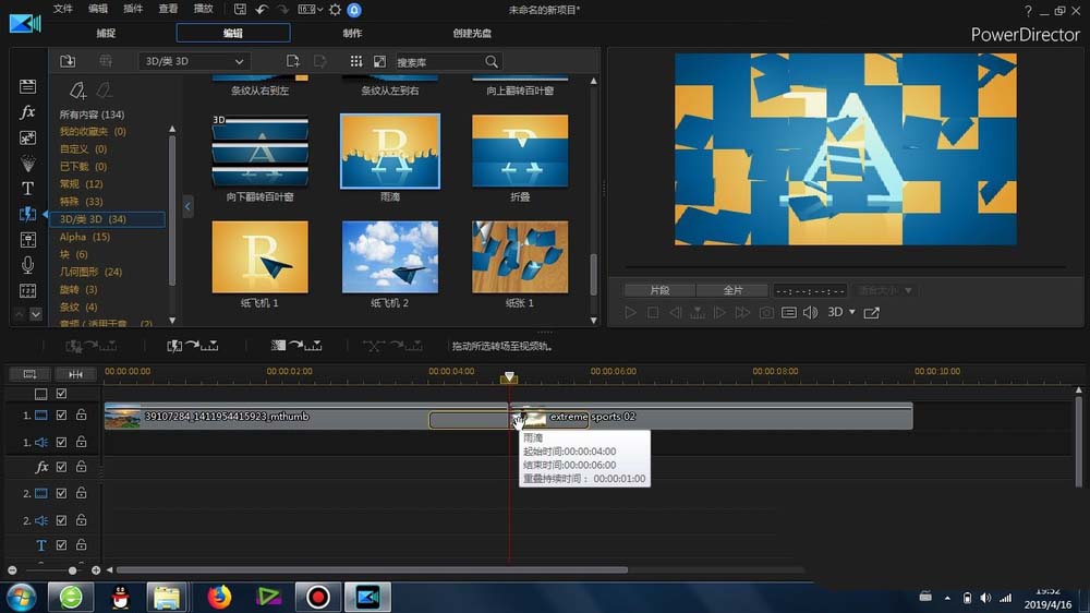 1、這里的“雨滴效果”轉場是在威力導演里面的-轉場-常規-里面可以找到