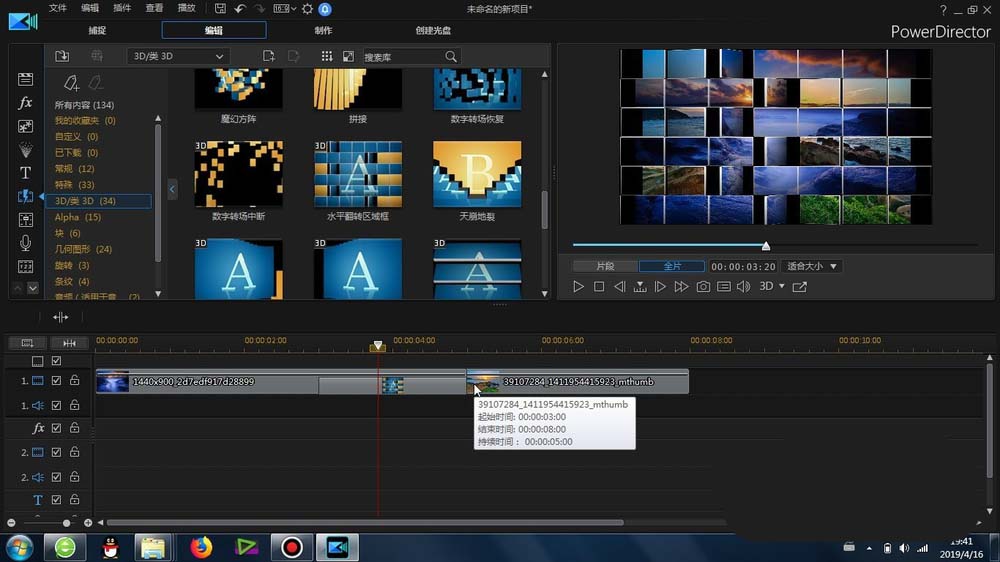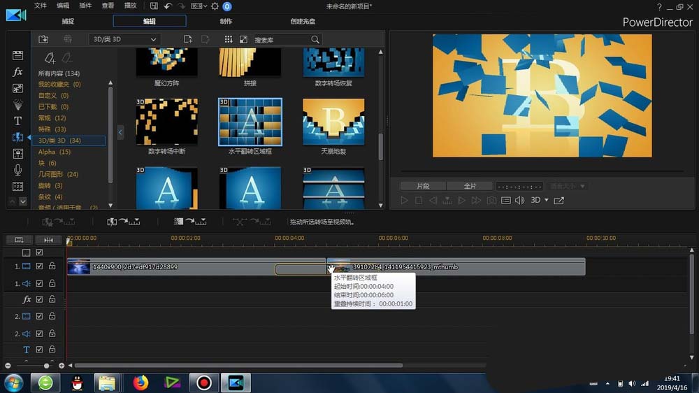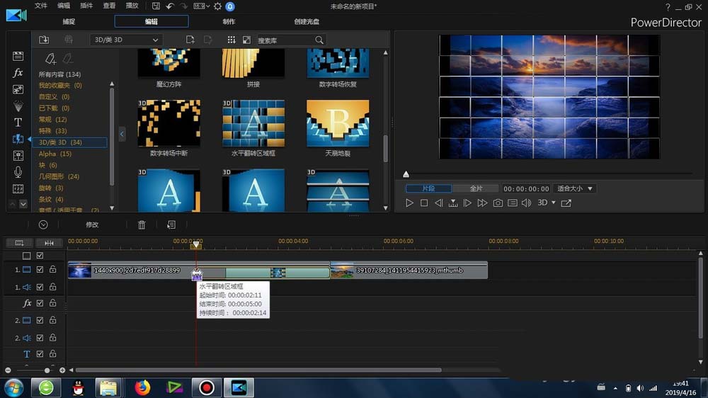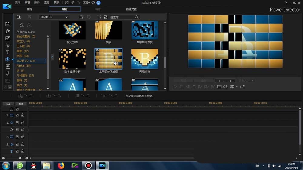 1、這里的“水平翻轉區域框效果”轉場是在威力導演里面的-轉場-3D/類3D-里面可以找到