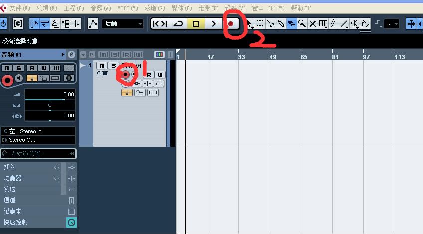 點擊圖中所示的1號按鈕,呈現紅色就是說明正在錄音,點擊2號按鈕,你就可以拿著麥克風錄歌;如果你不滿意錄制的干聲,可以點擊干音,按delete鍵,