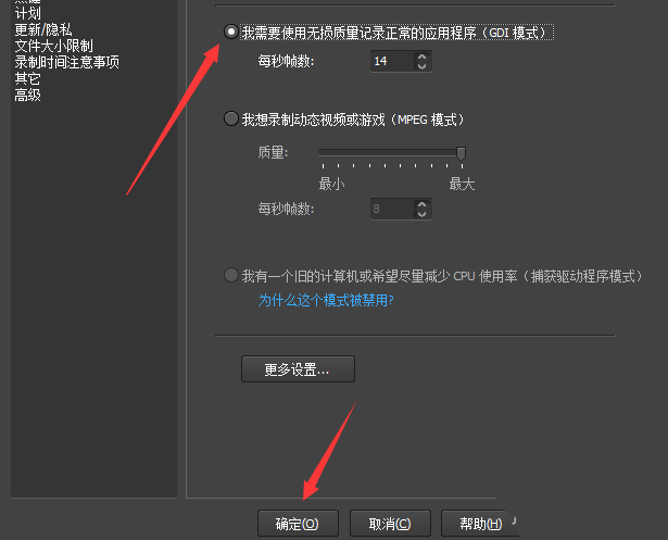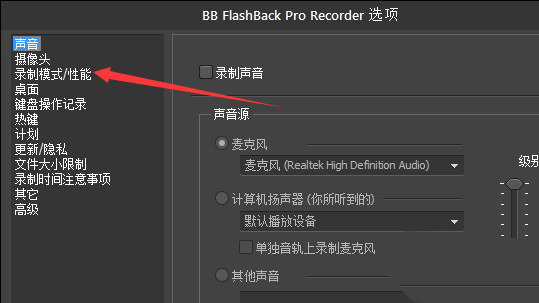 4、彈出了的選項窗口中,選中的錄制模式 的選項。