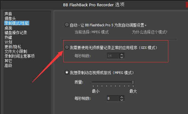 5、選中了左側中國的錄制模式性能的選項之后,勾選上我需要使用無損質量記錄正常?