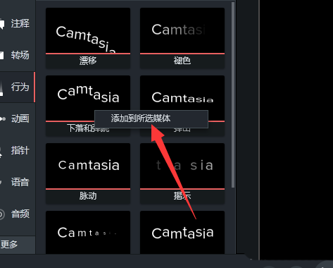 6、然后鼠標(biāo)移動(dòng)到某一個(gè)行為上面,你會(huì)看到這個(gè)行為的效果。覺(jué)得滿意,將它拖動(dòng)到注釋文字上(也可以點(diǎn)擊右鍵,添加到所選媒體)。