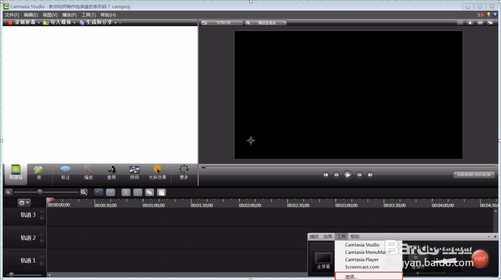 5、假設(shè)錄制的視頻沒有聲音,點(diǎn)擊“工具”——“選項(xiàng)”;