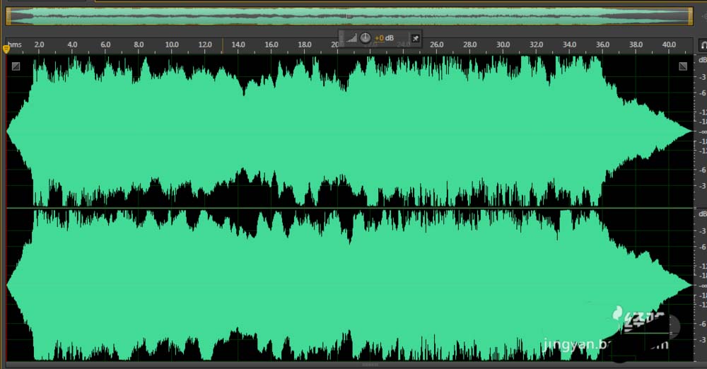 看:波形填滿整個空間,音量分貝快達到零{編輯器中顯示的音量分貝區間是(-∞,0)},零是最大值,接近零說明聲音過大了,而最適宜的音量分貝是(-12,-6)間的。