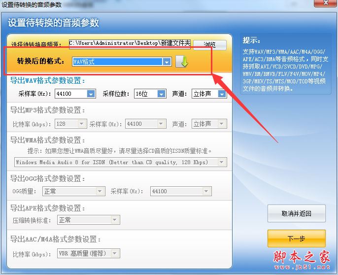 3、之后在設(shè)置音頻參數(shù)的界面我們選擇好想要轉(zhuǎn)換的格式,然后點擊“下一步”;