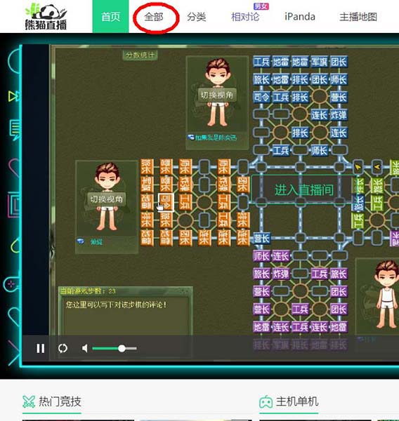 1、打開瀏覽器,在百度搜索輸入熊貓TV,打開官網,點擊“全部”