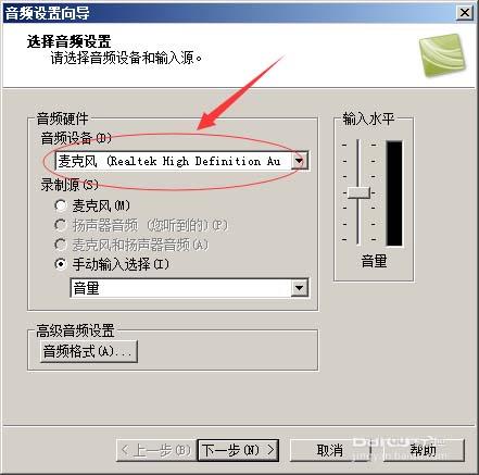 2、這個時候出現語音設置向導對話框,請選擇“音頻設置向導”,選擇“麥克風”點“下一步”,再點“完成”。即可開始進制錄制。