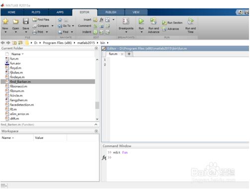 1.首先打開Matlab(本人使用的是Matlab 2015a,使用其他版本的Matlab影響不大)。在Common Window里輸入edit fun(fun可改為任意字符,只為演示用),打開M文件編輯器,此時已創建M文件,文件名為fun。