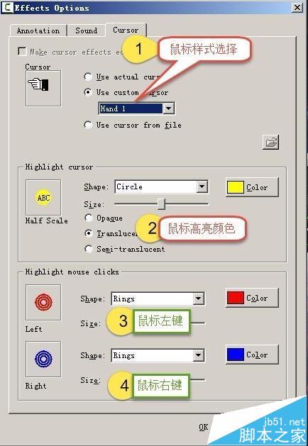 5、這個區域分四個部分,第一部分是編輯鼠標樣式的,第二部分是編輯鼠標高兩區的,第三和第四是編輯鼠標左鍵和右鍵單擊時的顏色。