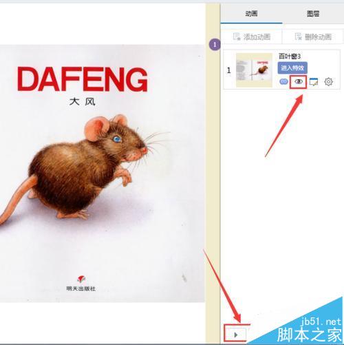 4、我們設置好我們的動畫特效過后,我們可以點擊預覽一下我們的動畫效果,這里我們可以點擊圖中所示的眼睛,或者點擊右下角的視頻播放圖標也是可以的,這兩種都是可以達到預覽的效果,不過那個播放動畫是會播放整個文件。