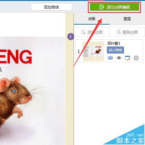 8、最后我們設置完成之后,我們需要做的就是退出我們的動畫編輯,這里我們的朋友可能會問,怎么沒有保存選項呢?其實我們點擊退出動畫編輯就已經默認保存了,如果不需要設置動畫,就把之前設置的刪除然后退出動畫編輯就可以了。