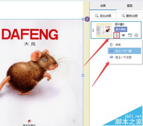 6、我們的動畫效果設置好后,接下來就是設置我們進入動畫的命令了,也就是說用什么來引導我們的動畫,這里我們點擊那個鼠標的圖標,然后會出現一個下拉選擇框,這里我們根據自己喜歡的方式來選擇就可以了。