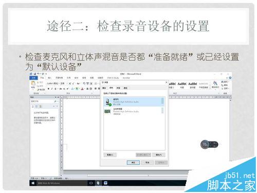 2、檢查麥克風和立體聲混音是否都“準備就緒”或已經設置為“默認設備”