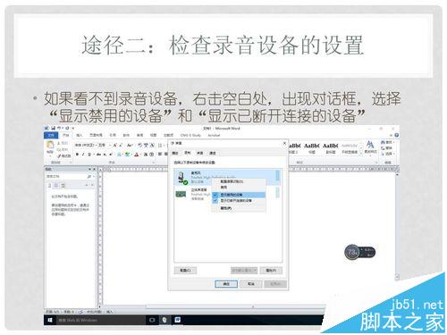 3、如果看不到錄音設備,右擊空白處,出現對話框,選擇“顯示禁用的設備”和“顯示已斷開連接的設備”