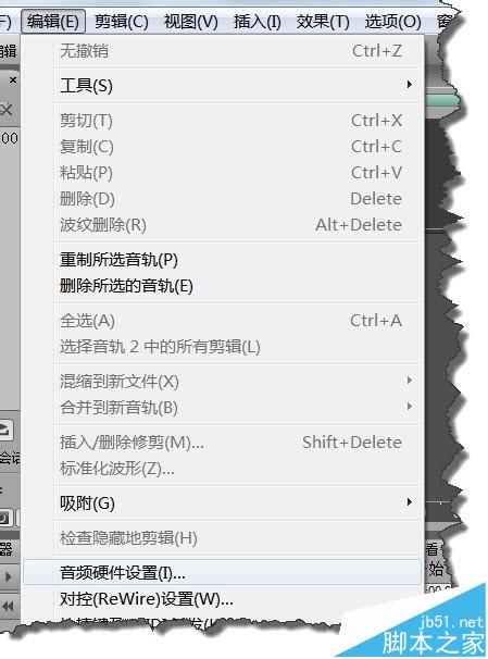 2、打開Audition,在”編輯“菜單中選擇”音頻硬件設置“命令。
