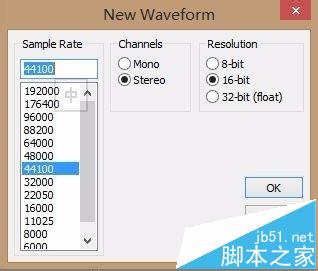 1、打開軟件后,點擊File選擇下拉菜單中New選項,彈出對話框,這里可以選擇你要生成的音樂的采樣率,是否雙聲道以及采樣精度。