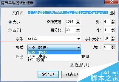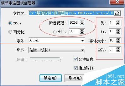 5、這里還可以選擇圖片寬,也就是你合成縮略圖的大小,越大的圖里面的小圖越清楚,但空間也就越大,這個大家自已按自已需求來定,我是默認的1024,百分比是按你播放影片大小的百分比來定。越是高清的電影百份比越高合成的圖越清。右邊是你要幾行幾列,右上的字本,小圖間的間隙,右上邊的文字包含哪些信息等,