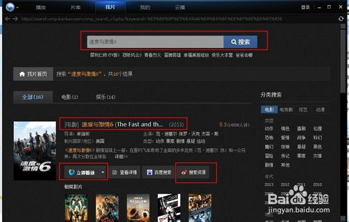 2、在視頻播放工具里搜索我們需要看的電影,如果我們要找的電影在播放平臺上只能觀看預告片的時候,就會多出一個選項“搜索資源”