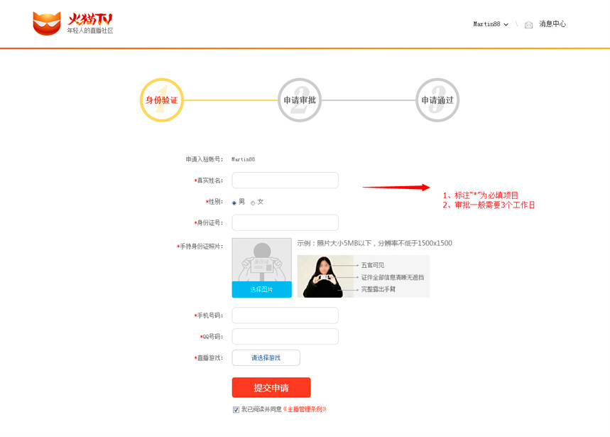 (填寫資料申請開通直播間,帶“*”項目,屬于必填項目,審核一般需要三個工作日)