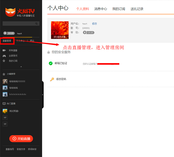點擊直播管理,進入管理房間進行房間設(shè)置