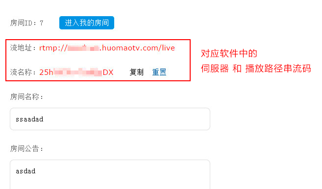 直播管理中的房間信息,流地址與流名稱分別對應(yīng)軟件中的伺服器和串流碼。
