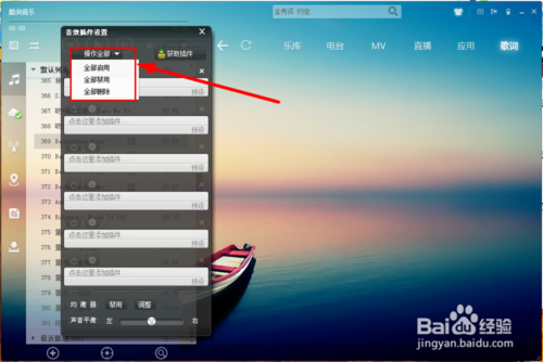 打開酷狗音樂(lè)軟件,點(diǎn)擊“主菜單”-“音效插件”,彈出音效插件框。