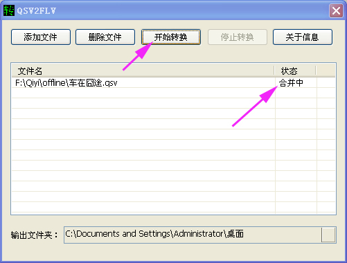 qsv文件添加進來之后,我們可以看到上面還有其他一些按鈕提示啦,“刪除文件”就是添加錯誤的文件,刪除重新添加,第三個按鈕“開始轉換”就是開始將qsv轉換成flv的按鈕啦。下面的輸出文件夾右邊有一個輸出路徑的設置。想要轉換完成后的文件存放路徑,我們點擊右邊的按鈕,就可以在彈出的對話框上修改路徑啦。