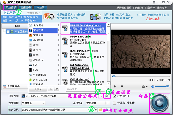 ②設置輸出格式,在上拉框中選擇:常用視頻--→MP4 即可;