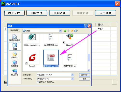 等到上面的提示是“完成”字樣之后,那么qsv格式就轉換完成啦,這時就可以在設置的輸出路徑上找到提取成功后的flv格式文件啦(在這里設置輸出路徑為“桌面”)。