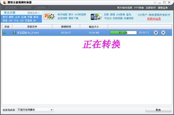 好了,在這里就設為MP4 ( 即MPEG4 )吧。設置好后,我們就點擊確定,退出高級設置?;氐杰浖鹘缑?,點擊 ⑤ 轉換按鈕,軟件即運行轉換,開始生成MP4格式的視頻了。如圖,正在轉換中:
