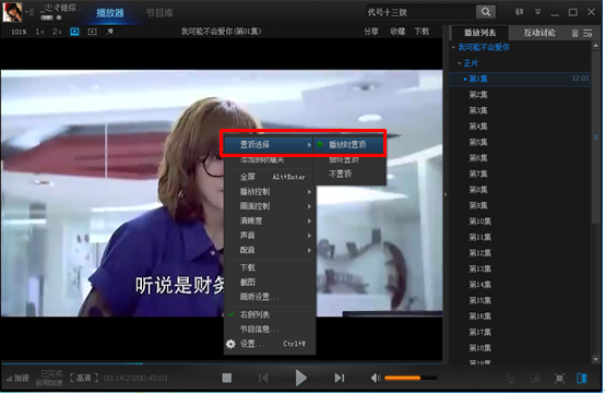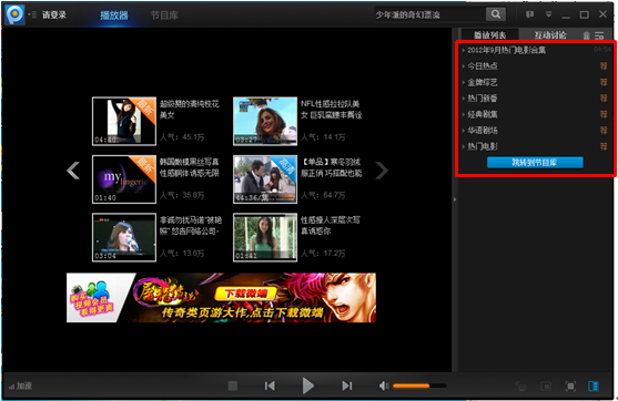 點(diǎn)擊“播放器”,右側(cè)“播放列表”中有的頻道信息,您可以單擊相關(guān)目錄來(lái)展開(kāi)或收起目錄,雙擊節(jié)目名稱(chēng)即可播放節(jié)目。當(dāng)您單擊節(jié)目名稱(chēng)后會(huì)在旁邊會(huì)出現(xiàn)節(jié)目信息,您可以直接在上面進(jìn)行節(jié)目集數(shù)的選擇