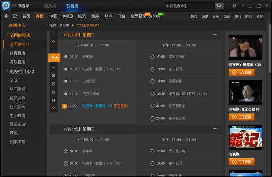 1) 在觀看直播節(jié)目的時(shí)候,如果希望知道不同的時(shí)間具體會(huì)直播哪些您想關(guān)注的內(nèi)容,那么您可以進(jìn)入“節(jié)目庫(kù)”窗口,點(diǎn)擊“直播”,在節(jié)目單下先找到自己想看的頻道(比如:東方衛(wèi)視)