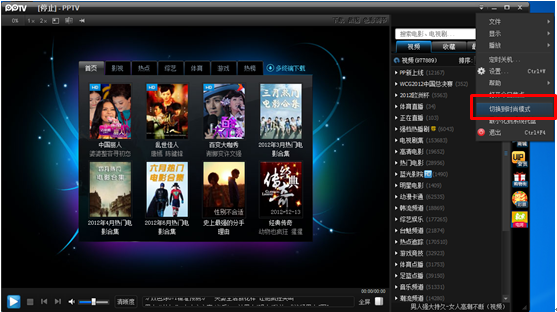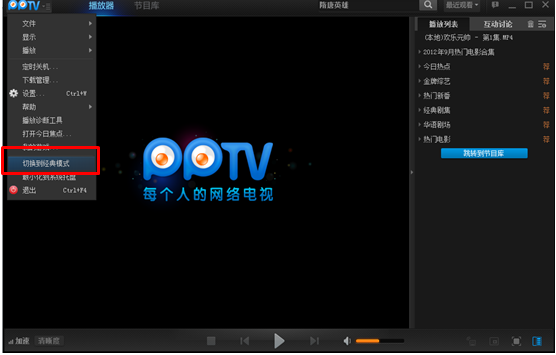 3) 雙擊“PPTV 網(wǎng)絡(luò)電視”,彈出節(jié)目庫(kù),點(diǎn)擊左上角“主菜單”按鈕,選擇“切換到經(jīng)典模式”即可完成時(shí)尚到經(jīng)典播放模式的切換