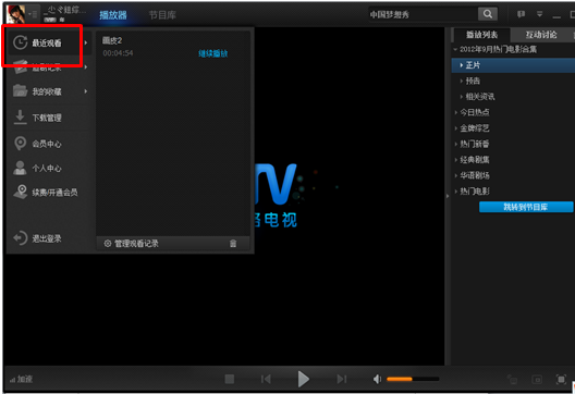 點(diǎn)擊左上角選擇下拉菜單的“最近觀看”,選擇播放的節(jié)目,就可以加入播放列表觀看節(jié)目