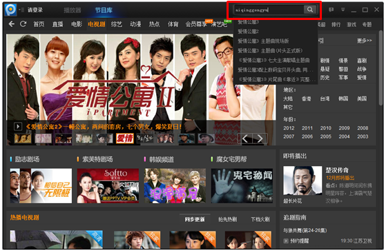 比如您想看《愛(ài)情公寓》,但是您不知道這部電影是什么類(lèi)型的片子,所以在現(xiàn)有的節(jié)目分類(lèi)中您無(wú)法逐步查找這部片子,那么您可以直接在軟件界面“視頻”列表上方的“搜索欄”內(nèi)輸入您想查詢(xún)的關(guān)鍵詞(如:愛(ài)情公寓),會(huì)有關(guān)鍵詞提示單供您選擇合適的搜索關(guān)鍵詞