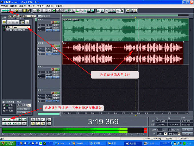 4 、錄音完畢后,可點(diǎn)左下方播音鍵進(jìn)行試聽(tīng),看有無(wú)嚴(yán)重的出錯(cuò),是否要重新錄制(圖 4 )