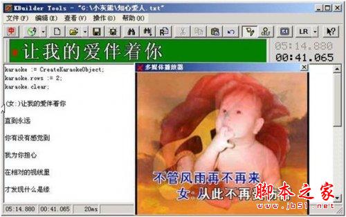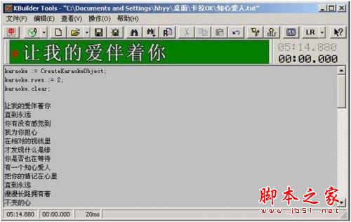 打開 KBuilder3.5,從“文件”菜單或工具欄中選擇“打開”,把“知心愛人.txt”裝載進來,也可以它直接拖到編輯框中。這時程序會自動在歌詞前面加上三行代碼 ,如下圖所示: