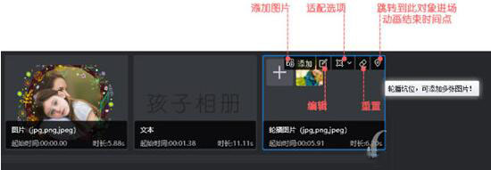 3、在輪播窗口中,支持添加圖片、編輯、重置等,大家還可以調(diào)整圖片適配方式,讓圖片完美的呈現(xiàn)在視頻中,這樣也就完成了圖片模板設(shè)置的全部?jī)?nèi)容,如下圖所示:
