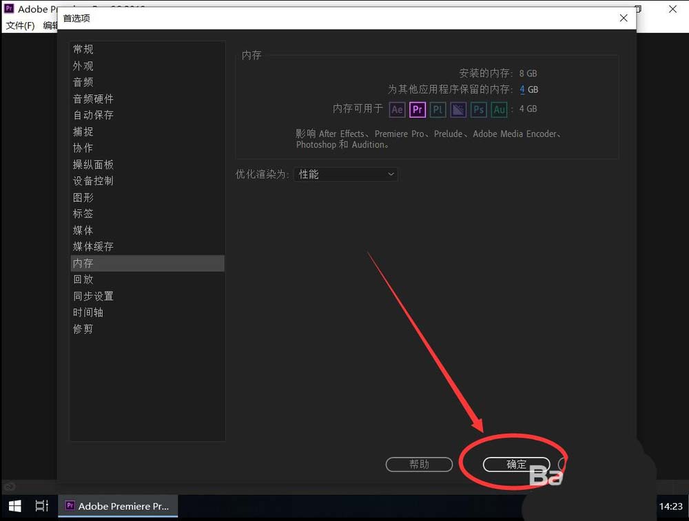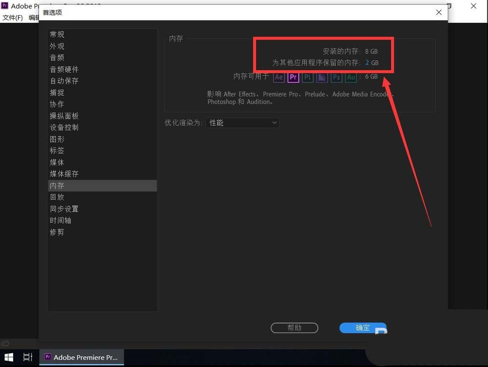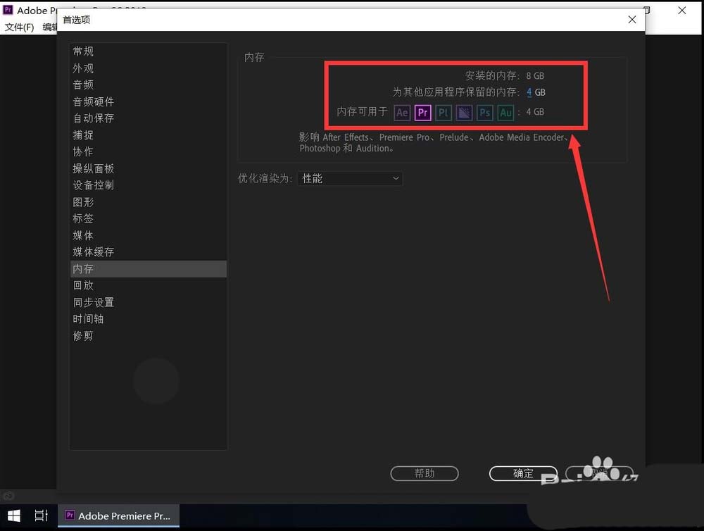 注意:不要把內(nèi)存都分配給Pr軟件,否則系統(tǒng)會(huì)因?yàn)閮?nèi)存不足變卡。